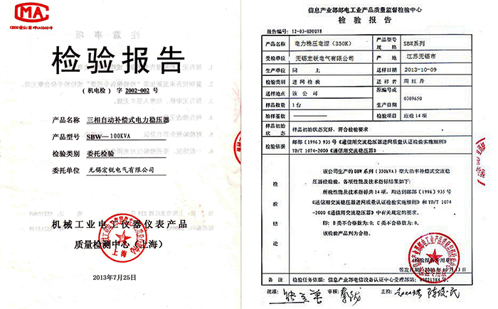 检验依据:GB19212.1-2008《电力变压器、电源、电抗器和类似产品的安全 第 1 部分:通用要求和试验》;检验结论:受无锡宏锐电气有限公司的委托对其递交的“三相全自动补偿式电力稳压器,型号SBW-100KVA”,按照上述检验 依据进行检验,所检项目符合标准要求。报告详情请参阅《三相自动补偿式电力稳压器检验报告》。