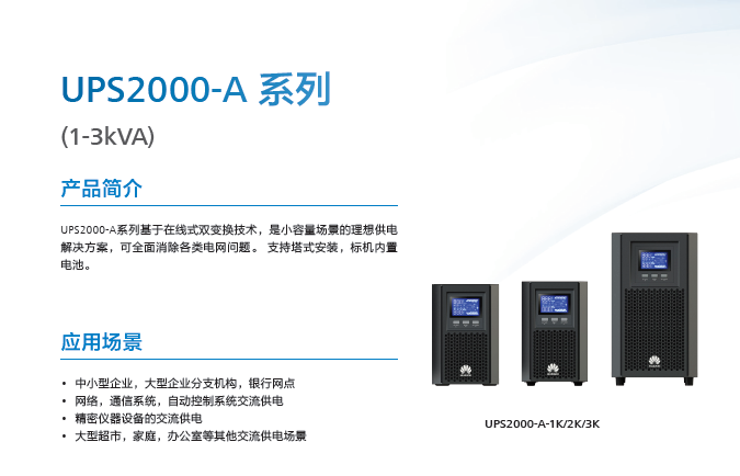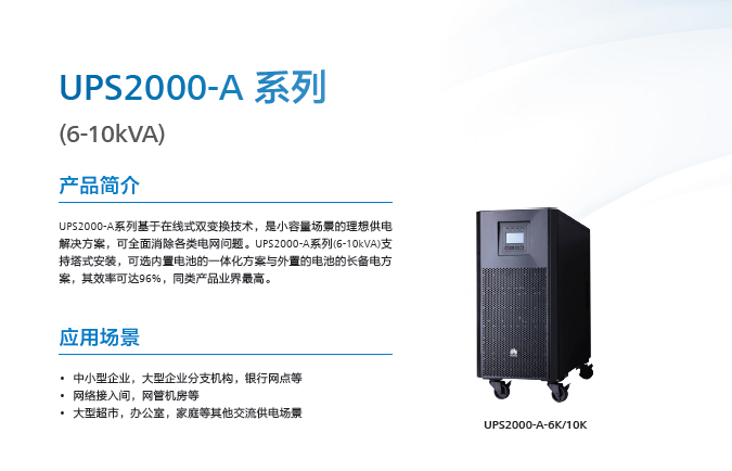 UPS2000-A系列涵盖了1-10kVA的容量范围,支持塔式安装与内置电池,可为分支机构、营业网点、办公等场景提供可靠的不间断供电。